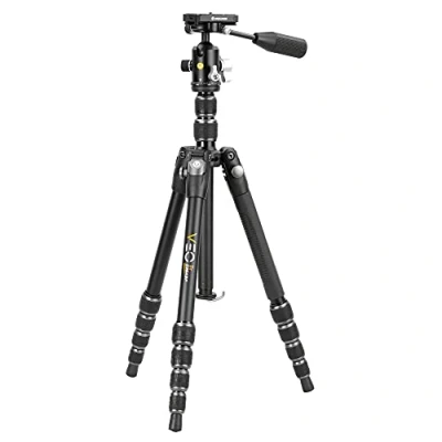 Compact with CNC machined build, 23mm, 5-section aluminium travel tripod Includes VEO BP-50T Arca compatible ball head with separate pan lock and removable telescopic pan handle to allow greater control Folds down to just 41cm and weighs just 1.75kg yet extends to 155cm with 8kg maximum load capacity 3-easy set leg angles for maximum stability in any position Low angle/macro shooting with reversable center column, or using the Low Angle Adaptor included Includes 70mm long quick release plate that can hold a smartphone up to 85mm wide Leg that converts to a monopod which combined with the included Bluetooth remote control allows centre column/monopod to be used for vlogging on the go Hook at base of central column to attach additional weight for added stability Rubber or Anti-Rust Stainless-Steel Spiked Feet for maximum stability on any terrain Tripod bag included