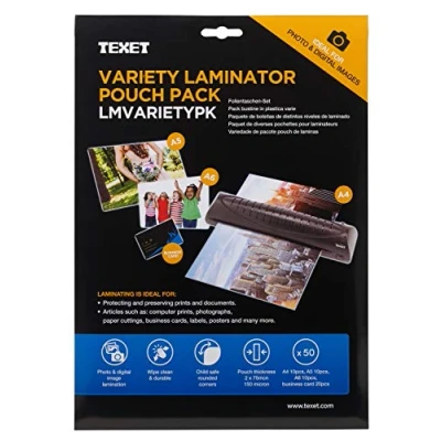 Laminator Pouches Variety Pack Contains: 10 x A4, 10 x A5, 10 x A6 and 20 x Business-Card sized pouches 2 x 75 micron thickness For best results, use with 'Texet' laminating products Wipe-clean and durable with child-safe rounded corners