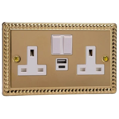 Varilight Classic Georgian Brass 2 Gang 13A Single Pole Switched Socket with 1x USB A & C Charging Ports White Inserts