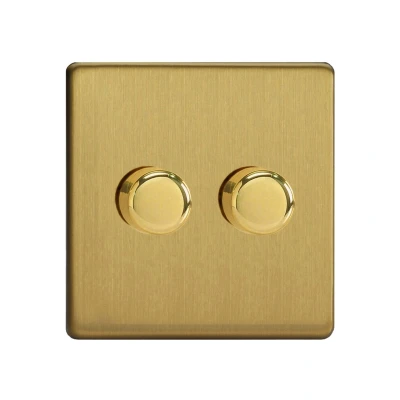 Varilight dimmer switches are designed for seamless operation with modern LED light bulbs, featuring V-Pro intelligent dimming technology for maximum compatibility. The Varilight 2 Gang 2-Way Push-On/Off Rotary LED Dimmer (2 x 0-120W, supporting 1-10 LEDs per gang) eliminates common issues like flickering and buzzing, ensuring smooth, reliable dimming with low-load LED bulbs.This advanced LED dimmer switch includes a soft start feature, gradually bringing lights to the desired brightness to extend bulb life, and intelligent overload protection to prevent damage in case of excessive load. With adjustable minimum brightness and a choice of driving modesNative Trailing Edge Mode and Programmable Leading Edge Modeit offers fine-tuned control and works with a wide range of dimmable LED bulbs.The dimmers sleek, screwless Brushed Brass faceplate complements modern interiors, combining a stylish look with practical functionality. With a maximum LED load of 2 x 120W (supporting up to 10 lamps per gang), this dimmer is ideal for both residential and commercial lighting setups.Specifications:Dimensions: 86x86x48mmFaceplate Depth: 4mmFixing Centres: 60.3mmRecommended Back Box Depth: 35mmOperating Voltage: 230V 50HzMaximum Current: 0.9ATerminals (Live & Earth) Diameter: 3.2mm and 3.3mm (3 x 1.5mm capacity)Part of Varilight's Screwless Collection, this British-made dimmer switch combines high performance with a timeless Brushed Brass finish, backed by Varilight's lifetime guarantee. Perfect for those looking to enhance their lighting with a reliable, stylish LED dimmer switch.Safety Advice: Not compatible with non-dimmable fluorescent bulbs, TRIAC loads, wire-wound transformers, or motors. Do not overload. Must be earthed.Intended Applications: Indoor Use Only. Domestic lighting circuits including many dimmable LEDs.