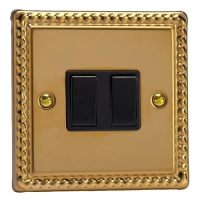 Classic Georgian Brass double 2-Way light switch with black rockers — timeless rope-edged design with dependable 10A performance Elegant and practical: 2-Gang 2-Way switch in Georgian Brass with black rockers for reliable lighting control Georgian Brass pairs an elegant rope-edged design with a rich brass finish for a look that feels both traditional and refined. A timeless choice, Georgian Brass adds classical character and enduring style to interiors of every kind Proudly designed and manufactured in Great Britain, with reliability you can count on — backed by a Lifetime Guarantee, Weight: 0.26014546916 Pounds, Manufacturer: Varilight