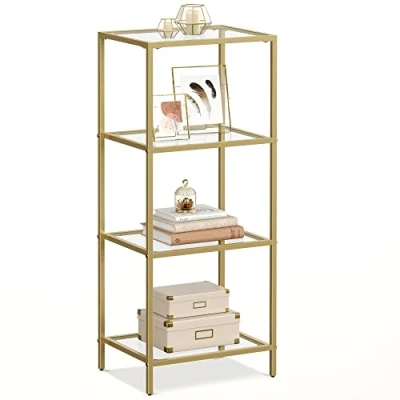 VASAGLE 4 Tier Glass Shelf, Bookshelf, Storage Rack, Tempered Glass, Easy Assembly, for Bathroom, Living Room, Bedroom, Office, Metallic Gold LGT28G