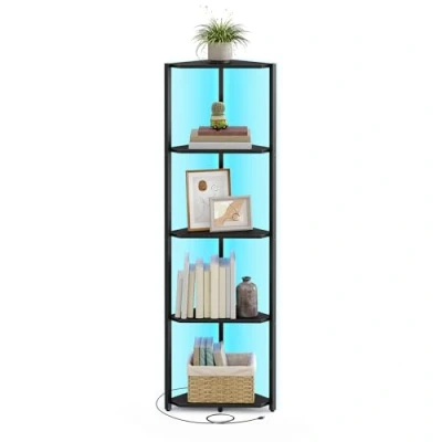VASAGLE 5 Tier Corner Shelf, Bookcase with Adjustable LED Lights, Storage Shelf Steel Frame, 24.8 x 48 146.6 cm, for Living Room, Bedroom, Study, Ebony Black LBC590B02