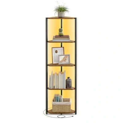 VASAGLE 5 Tier Corner Shelf, Bookcase with Adjustable LED Lights, Storage Shelf Steel Frame, 24.8 x 48 146.6 cm, for Living Room, Bedroom, Study, Rustic Brown LBC590K02