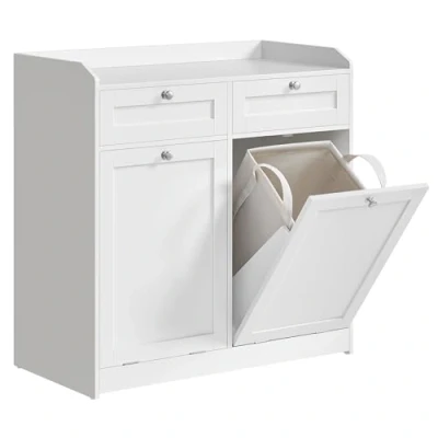 【BATHROOM CABINET AND LAUNDRY BASKETS IN ONE】In addition to a top shelf and 2 drawers that provide easy access to your items, this bathroom cabinet also offers 2 laundry baskets to meet your laundry storage needs 【REMOVABLE AND PORTABLE LAUNDRY HAMPERS】On laundry day, you can effortlessly lift out the inner fabric baskets from the tilt-out laundry cabinet. With their convenient double handles, you can easily carry them right to the washing machine 【EASY TO CLEAN】The laundry baskets have a water-repellent interior coating for effortless cleaning. As for the surface of this storage cabinet? A simple wipe with a cloth keeps it spotless 【STURDY AND DURABLE】The laundry compartments of this storage unit are reinforced with trapezoidal panels and metal hinges, ensuring strong support for your laundry and long-lasting durability 【SAFE AND STABLE】The raised edge on the top shelf prevents items from falling off, while the included anti-tip kit secures the bathroom organiser to the wall for enhanced stability and safety