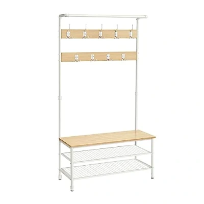 [Style Meets Organisation] Marrying clean lines with the industrial-style pipe and modern oak-white palette, this coat rack with shoe storage brings a unique charm to your home and keeps your hallway messes at bay [4 in 1 for Your Different Needs] After coming back home at the end of the day, just hang your coat, hat, or scarf on any of 4 dual hooks or 5 tri-hooks, sit on the 100 cm long bench to remove your shoes, and put them on the 2 steel mesh storage shelves [Practical Hanging Rail] The hanging rail on top equals a tiny wardrobe. You can put up some hangers to organise your suit jacket, shirt, or outerwear, for crease-free, grab-and-go ease [Sturdy & Stable] Crafted with heavy-duty steel pipes and quality particleboard, this hall tree can hold up to 100 kg on the shoe bench, 15 kg on the hanging bar, 3 kg on each hook, and 20 kg on each metal shelf [Easy to Assemble] With labelled parts and clear instructions, you can easily assemble this 41.5 x 100 x 182 cm coat stand to tidy up your hallway, living room, or bedroom (Secure it to the wall with included anti-tip kit)