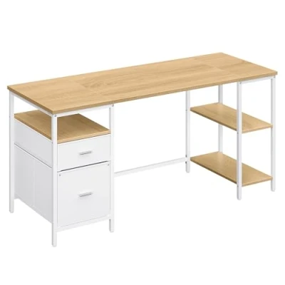VASAGLE Computer Desk, Work Desk with Storage, 3 Shelves, 2 Drawers, 160 x 60 76 cm, for Home Office, Living Room, Industrial Style, Natural Oak and Cloud White LWD105YD01