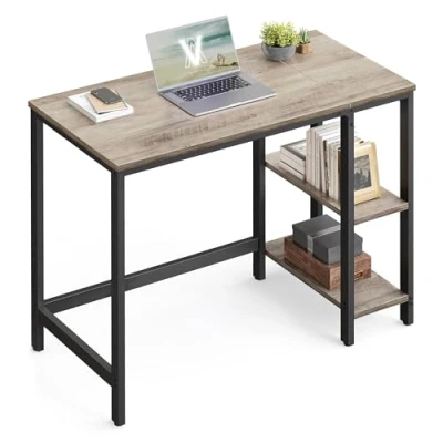 【FLEXIBLE STORAGE SHELVES】2 storage shelves, one of which is removable, can be installed on the right or the left as you need. Plus, you can remove the middle shelf to fit your computer tower or keep it to store books, files, or other often-used items 【LARGE DESKTOP SPACE】With a 60 x 100 cm desktop, this computer desk accommodates 2 computer monitors, a keyboard, and other office essentials while giving you enough workspace, keeping you productive when working from home 【STURDY AND DURABLE】Robust steel frame and quality particleboard make this office desk stable and durable. So feel free to put everything you need for work, study, or recreation on it, this desk can handle it! 【PRACTICAL ADJUSTABLE FEET】The adjustable feet keep the writing desk stable on slightly uneven floors and protect your floor from scratches. No more annoying wobbles to disturb you when you’re immersed in work or study 【EASY TO ASSEMBLE】Detailed instructions and clearly labelled parts are provided to help you set up this writing desk with shelves easily and quickly, saving your time, effort, as well as energy