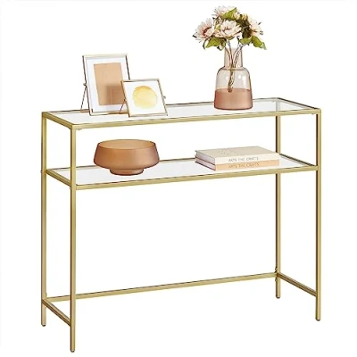 [Stunning Minimalism] Take your home to the next level with a modern console table that unites sleek, metallic gold steel and a tempered glass top into one minimalist-yet-functional piece [Transparent Support] Each 5 mm thick tempered glass shelf nestled atop the steel frame of this 35 x 100 x 80 cm (D x W x H) console table, offering sturdy support for up to 30 kg of plants, decorations, books, or cherished family heirlooms [Use Your Way] Imagine this modern tempered glass table in your home—where is it? In the living room as a sofa table? By the door as an entryway table? Or in the hallway as a console table? It’s up to you [Done in a Jiffy] There’s no need to take an afternoon off work to assemble this sturdy sofa table (as much as you might want to!); with simple instructions and numbered parts, you can have it set up in no time [Goodbye, Wobbles] If slightly uneven floors are the bane of your existence, the adjustable feet underneath the legs of this tempered glass console table are here to save the day, keeping everything stable and in place