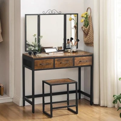 Left, Right, Front, Check: See yourself with the three-fold mirror of this vanity, perfect your makeup and hair from any angle and start your day with a gorgeous, perfect look Rich in character, simple design: A rustic brown wood surface, black metal edges and bones, slender handles and dense metal mesh - the warm wood tones and cool industrial elements give a chic rustic feel A strong team: Stable steel frame, quality chipboard - This unbeatable team works hand in hand and forms a strong foundation for your skincare products, makeup, perfumes and a vase of flowers if you want to give a refreshing touch Free countertop: Who wants to make their makeup surrounded by messy piles of eyeshadow palettes, lipstick and liners on the tabletop? Not us. With 3 spacious drawers, it's time to get everything away from the counters What you get: A dressing table and stool set, 4 adjustable feet, necklace hooks on the back of the mirror, clear instructions and numbered pieces for easy fitting, and a charming rustic design from the VASAGLE's ALINRU Collection