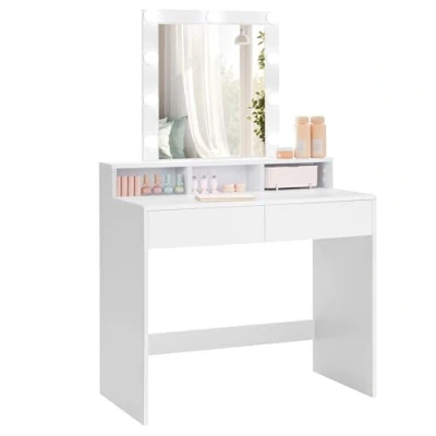 Modern and Minimalist: Explore the KAILYN Collection! A clever blend of bright white colour, smooth surfaces, and handleless drawers. With its different pieces, you can create a cosy and harmonious interior that matches your style! Lights With Adjustable Brightness: This dressing table is equipped with 9 light bulbs with adjustable brightness. By long pressing the switch, you can freely adjust the brightness to find the right light for perfect makeup Multiple Storage Spaces: 1 raised shelf for perfumes, 3 open compartments for lipsticks, 2 spacious drawers for hairdryers and hair straighteners, and 1 large tabletop. This vanity table offers several spaces to keep all your beauty products tidy Anti-Tip Kit for Added Safety: Secure the makeup table to the wall with the included anti-tip kit to create a safer environment Sturdy and Easy to Clean: Made from quality particleboard, this makeup station is sturdy and durable. Its surface is wear-resistant and easy to clean, so you can enjoy long-lasting use