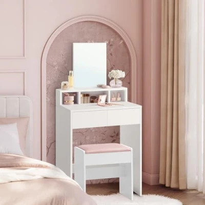 Modern and Minimalist: Explore the KAILYN Collection! A clever blend of bright white colour, smooth surfaces, and handleless drawers. With its different pieces, you can create a cosy and harmonious interior that matches your style! Roomy Yet Space-Saving: Featuring 2 drawers, 1 large shelf and 3 open compartments, this dressing table offers plenty of space to keep your cosmetics tidy and within reach. Taking up only 40 x 60 cm of floor space, it's perfect for small spaces Large, Clear mirror: The 30 x 40 cm (W x H) large mirror of this makeup table allows you to check yourself clearly and achieve flawless makeup application Anti-Tip Kit for Added Safety: Secure this vanity table to the wall with the provided anti-tip kit to create a safer environment for your family Sturdy and Easy to Clean: Made of quality particleboard, this dressing table is sturdy and durable. The veneer surface makes this table wear-resistant for long-lasting use and easy to clean
