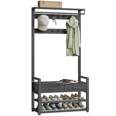 [Multifunctional 6-in-1 Design] This hall tree combines 10 coat hooks, 2 drawers, a clothing rail, a bench, a shoe rack, and storage shelves to optimise your space and help you create an organised and functional entryway [Generous Storage Space] Equipped with 10 removable hooks, this entryway furniture allows for the convenient hanging of coats, hats, scarves, and bags. Additionally, the 2-tier shoe rack can accommodate 8 pairs of shoes [Durable and Handy Drawers] Made from Oxford fabric, the 2 drawers offer reliable durability. Their design, featuring convenient handles, makes it simple to hide away and access items as needed [Customisable Design] You can use this hall tree as a whole to keep everything you need in one place, or split it into a wall-mounted coat rack with shelf and a shoe bench for separate use [Robust and Secure] Crafted from a high-quality particleboard panel and sturdy steel, this coat rack with shoe bench is built to last. Its adjustable feet and the included anti-tip kit ensure superior stability and safety