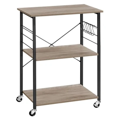 VASAGLE Kitchen Shelf on Wheels, Serving Trolley with 3 Shelves, Microwave Shelf, for Mini Oven, Toaster, 6 Hooks, Industrial Style, Greige and Black KKS060B02