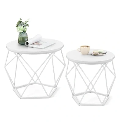 [Practical Size] The large coffee table is 50 x 40 cm and the small coffee table is 40 x 36 cm. They are perfect for small spaces, serving appetizers, decorating, working on a computer [Simple and easy] With illustrated instructions and numbered parts, assembly is done before you even know it. Don't worry if you lose a screw, there are spare parts in the package [Stable and Solid] Made of quality chipboard and sturdy steel, these 2 round tables are stable, they do not wobble when you put down your coffee cup. Each side table supports up to 20 kg [Together or Separately] Use these 2 small tables together in your living room to set plants or use them separately, one next to the sofa and the other in the bedroom. They are practical everywhere [Industrial Style] This set of modern style coffee tables brings a unique touch to your home. With a snow-white round tray and a geometric cloud white steel base, their original design will capture your guests' attention