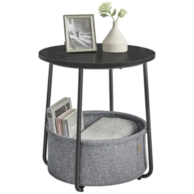 VASAGLE Side Table, Round End Table with Fabric Basket, Spacious, for Living Room Bedroom, Bedside Modern Style, Ebony Black and Slate Grey LET223B01