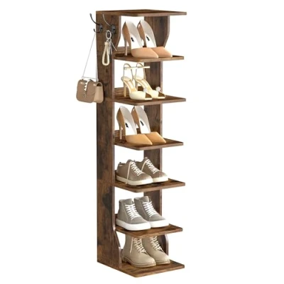 [Fits Small Spaces] Measuring 30 x 26.4 x 110.4 cm, this slim shoe organiser efficiently utilises floor space, making it ideal for small hallways, apartments, or other tight areas [Convenient Hook Storage] Hang your keys and wallets on the narrow shoe rack's hooks for a quick grab-and-go during your morning rush. Even better, the hooks can be installed on the left or right as needed [Holds Taller Shoes] Loafers, sneakers, hiking shoes, boots...all of them can be well accommodated on the shelves with 17 cm between each, tall or short [Offers Strong Support] Crafted with particleboard, this tall shoe stand boasts great strength (max. 10 kg load for each shelf), so you can set heavy climbing shoes on with ease [What You Get] A 7-tier slim shoe rack with backboards to add stability and protect your wall from scuffs, plus an anti-tip device to help you secure the shoe tower to the wall for safety