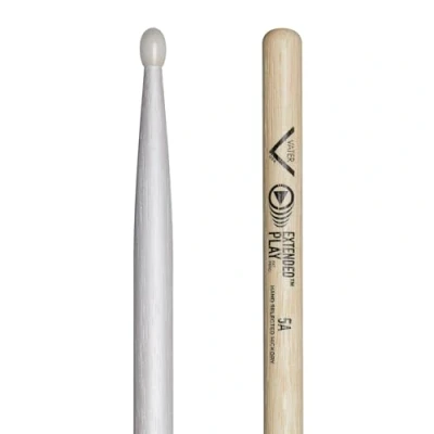 The Vater Extended Play Series are made in the USA from american hickory which offer the optimal balance and feel of a Vater hickory stick but with advanced durability and resistance to rimshot fatigue and breakage The Vater Extended Play 5A shares its dimensions with the popular Los Angeles 5A with a specially formulated durable finish that protects the nylon tip and shoulder and is fitted with Vater proprietary drumstick Shield to enhance the life of the drumstick. Wood Type: Hickory | Taper: Short Tip: Nylon | Tip Shape: Oval Stick Diameter: 0.570" | 1.45cm Stick Length: 16" | 40.64cm