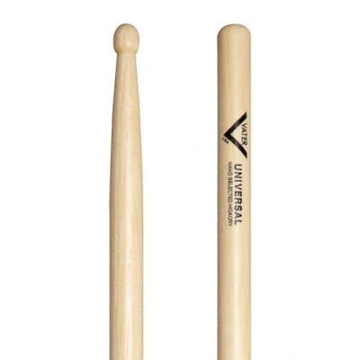 Made in the USA from high grade American hickory, Vater Drumsticks are made the same as they've always been, resulting in a consistent and durable drumstick: Hands-on craftsmanship, higher moisture content in the raw material, lathe turned, tumble finished and hand rolled. All Vater Drumsticks are tone and weight matched by computer analysis. Slightly thinner than a 5B but with a sturdy neck and rounded ball/barrel hybrid tip the Vater Universal American Hickory model is great for extra volume and attack without excess weight. Also avialable in the NUDE series Wood Type: Hickory | Taper: Short Tip: Wood | Tip Shape: Barrel Stick Diameter: 0.595" | 1.51cm Stick Length: 16" | 40.64cm