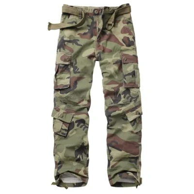 Material: The hiking trousers mens are composed of 65% polyester and 35% cotton.The mens hiking trousers are comfortable, breathable, dry fit, wear-resistant, and have a comfort fit side waist. The broad belt loops offer excellent support. Features : Straight leg openings with a drawstring tie to fit with boots, belt loops design, practical and deep multi-pocket layout, button closure on the fly, and a regular fit. Men’s cargo trousers are designed to fit loosely around the knee, thigh, and seat, giving you superior protection and unrestricted mobility. Men's Work Trousers with Multiple Pockets: The tactical trousers feature 8 functional and stylish pockets, including 2 slant pockets on the front, 4 thigh pockets and 2 back pockets. The thigh and calf pockets are buttoned, making them ideal for safely storing small items and devices like wallets, tools and cell phones. Occasion: Combat trousers for men are appropriate for daily casual wear, outdoor activities, hiking, fishing, hunting, chasing, jogging, climbing, extreme sports, skateboarding, and work .Perfectly paired with a vest, T-shirt, or shirt to create a distinctive and stylish cargo style. Note: Belt needs to be purchased separately.Machine wash with low temperature or hand wash recommended.The camouflage trousers are perfect gift for your husband, father, son and friends on special occasions like Christmas, Valentine's Day, Christmas, and New Year's.