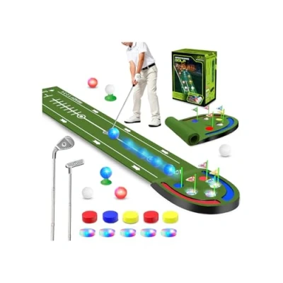 GLOW-IN-THE-DARK GOLF FUN: This exciting Light up golf set includes 3 glowing golf balls and 5 colorful light-up hole cups, perfect for nighttime or dimly lit play. The LED balls light up automatically when hit, creating a magical mini-golf experience in the dark! The glow-in-the-dark design not only makes play more fun but also helps kids track their shots and improve hand-eye coordination EASY SETUP, INSTANT PLAY: No tools or complicated assembly! Just follow 4 simple steps, and the mini-golf course is ready for action. ①Assemble 4 pieces black base plates together. ② Peel & stick the adhesive strips for extra stability. ③Put the golf putting mat on the plates, and ensure the golf mat is aligned with the edge of the base plates. ④Finally insert the flags and golf cups to start the golf game KID-FRIENDLY PUTTING MAT: The 9ft soft felt golf mat features a non-slip backing for stable play, providing the perfect smooth surface for safe indoor adventures! Guide lines of golf mat not only help kids aim their shots with confidence, but also teach them basic golf concepts through play. The tear-resistant material withstands energetic play, while the lightweight design allows to easily storage COMPLETE PLAY SET FOR ENDLESS FUN: In addition to the golf putting mat,it is also equipped with 2 clubs (putter & iron), golf balls×6 (3 standard + 3 glow balls), interchangeable holes×10 (5 standard cups + 5 glow cups) and numbered flags×5. The 3.4in holes make it easy for beginners to succeed, while the progressive challenge distance helps kids gradually improve their motor skills and hand-eye coordination UNLEASH GOLF FUN: Light up golf set is a interactive gift for sport-loving kids, perfect for birthdays, holidays or as an encouraging surprise. It allows children to enjoy putting fun in the living room, backyard or at night parties. The lightweight and portable design makes storage effortless. It's a practical gift that brings lasting joy while helping develop kid's hand-eye coordination and interest in golf, Manufacturer: VATOS