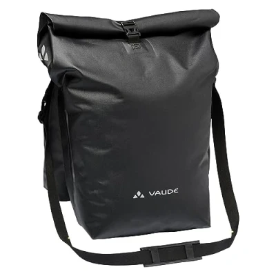 Double bike bag for hanging on the pannier rack Throw principle, 2 main compartments Waterproof welded, with removable shoulder strap Climate neutral, made from predominantly recycled materials