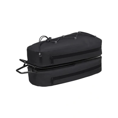 Large saddle bag for road bike or MTB 2 separate main compartments with zip Elastic material attachment Klickfix mounting system: included. Climate neutral: emissions from materials, manufacturing process and shipping have been holistically determined and systematically reduced. Currently unavoidable emissions have been fully compensated by the independent non-profit organisation "myclimate"