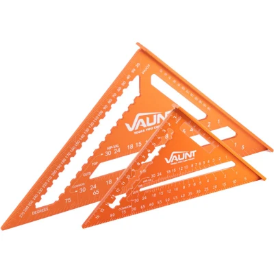 General description Heavy duty speed square set made from extra thick aluminium for superior strength, yet incredibly lightweight. Ideal for quick and accurate measurement readings, with ultra-clear laser etched markings and bright powder coating for easy visibility and rust prevention. The Vaunt metric roofing squares come in 180mm and 300mm, complete with common, hip and valley measurements, as well as protractor functionality. Use as a protractor, try square, mitre square, framing square, or for quick and easy 90-degree and 45-degree angles. Technical specifications Material: Extra thick aluminium Sizes: 180mm and 300mm Markings: Clear laser etched Functionality: Protractor, try square, mitre square, framing square Other information Includes: 1 x 180mm Speed Square, 1 x 300mm Speed Square Features: Strong thick cast aluminium, wide base for stable alignment
