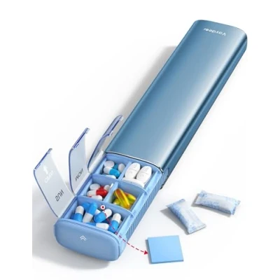 Thoughtful details in a compact form — organise your week with a robust aluminium alloy shell and clear daily layout — daily medication box, weekly pill organiser. Moisture protection for potency — moisture‑control design protects vitamins and tablets from humidity; ideal as a travel pill organiser and weekly pill organiser. Intuitive glide mechanism with clear day labels — portable enough for bags and drawers; doubles as a slim pill organiser and daily medication box. Balanced for daily use — the sweet spot of size and utility; works as a daily medication box while remaining a travel pill organiser. Fresh Blue accent with clean lines — a travel pill organiser that feels premium in hand. A thoughtful companion for your daily routine – by VAYDEER.