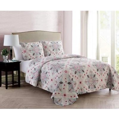 Designed to give your bedroom a pop of pattern, the Wyndham Medallion Quilt Set features intricately-detailed medallions in blue, pink, and white. The soft microfiber set includes a quilt and shams for a perfectly coordinated look. Super-soft - 100% microfiber Features multi-colored medallion pattern Set includes quilt and shams Model Number: WYH-3QT-KING-IN-MULTI Package Dimension: 17.0" L x 17.0" W x 9.0" H