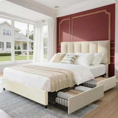 VECELO 4ft6 Double Bed Frame with 4 Storage Drawers, Upholstered Platform Bedframe Adjustable Velvet Headboard, Sturdy Wooden Slat Support, No Box Spring Needed, Easy Assembly, Beige