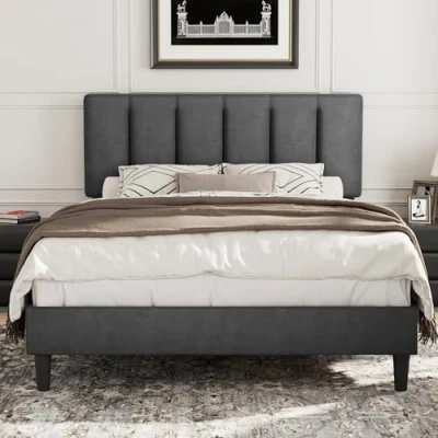 VECELO Double Size Bed Frame 4ft6 Upholstered Platform with Adjustable Velvet Headboard, Sturdy Wooden Slat Support, No Box Spring Needed, Easy Assembly, Dark Grey