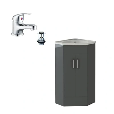 SPACE-SAVING CORNER DESIGN FOR SMALL BATHROOMS: The VeeBath 400mm Corner Cloakroom Vanity Unit is explicitly designed to maximise floor space in compact areas. Its smart triangular shape fits neatly into corners, making it ideal for cloakrooms, en-suites, and tight bathroom layouts. This unique design provides both a functional wash area and discreet storage without overwhelming the room, offering convenience and style in one compact solution. MOISTURE-RESISTANT WOODEN CABINET WITH ANTHRACITE GREY FINISH: Built from high-quality, moisture-resistant engineered wood, this vanity unit is built for long-term performance in humid bathroom environments. The smooth Anthracite Grey finish adds brightness to the room while resisting scratches, stains, and everyday wear. The cabinet door features soft-close hinges, reducing noise and improving the overall user experience with a touch of luxury. EASY INSTALLATION WITH FULL CUSTOMER SUPPORT: Designed for straightforward setup, this corner vanity unit is compatible with standard UK plumbing systems. Whether installed by a professional or as a DIY project, the included fittings and simplified installation process ensure quick assembly. VeeBath also provides helpful and responsive after-sales support, giving you added peace of mind during and after installation. FULL PACKAGE, DIMENSIONS & 2-YEAR MANUFACTURER’S GUARANTEE: This complete bundle includes 1x corner vanity unit, 1x ceramic basin, 1x mono basin mixer tap, and 1x pop-up waste. Dimensions: H91.6 x W41.2 x D41.2cm, ideal for tight spaces. Made from premium materials and built to last, this unit is backed by a 2-year manufacturer’s guarantee, ensuring long-term quality, durability, and total customer confidence., Manufacturer: VeeBath
