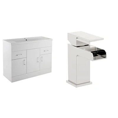 VeeBath Sobek 1000 Vanity Unit with Basin and Waterfall Mixer Tap, Floor Standing Cabinet Rectangular Ceramic Wash for Bathroom Furniture 3 Doors 2 Drawers Gloss White (Flat Pack)