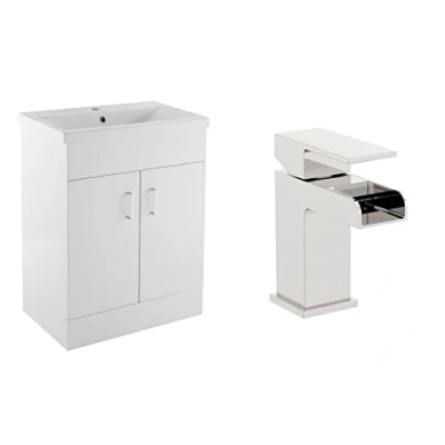 VeeBath Sobek 600 Vanity Unit with Basin and Waterfall Mixer Tap, Floor Standing Cabinet Rectangular Ceramic Wash for Bathroom Furniture 2 Doors Gloss White (Flat Pack)