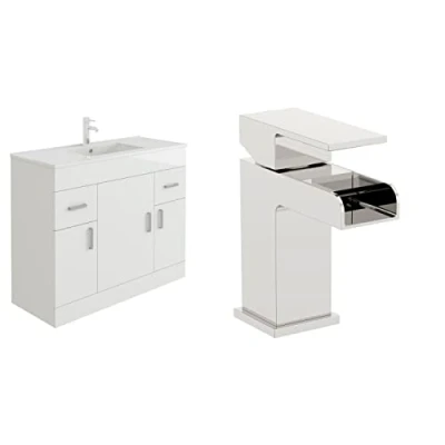 VeeBath Sphinx 1000 Vanity Unit with Basin and Waterfall Mixer Tap, Floor Standing Cabinet Rectangular Ceramic Wash for Bathroom Furniture 3 Doors 2 Drawers Gloss White (Flat Pack)