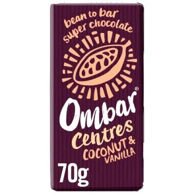 VEGAN CHOCOLATE BAR: From our indulgent Centres range, this vegan chocolate bar has a deliciously sweet and creamy coconut and vanilla centre, encased in our classic 60% dark chocolate. The perfect vegan treat to satisfy that sweet tooth! DAIRY & GLUTEN FREE: Made with all-natural, plant-based ingredients, our vegan chocolate is completely free from dairy and certified vegan by the Vegan Society. We achieve a delicious creamy taste by using creamed coconut instead of milk, and all of our chocolate contains absolutely no gluten. RAW CACAO: The cacao we use is sourced from Ecuador; the country's climate produces some of the best tasting cacao in the world. Most chocolate is made by roasting cacao at high heat, which could damage the heat-sensitive cacao polyphenols (super-healthy plant compounds). At Ombar, our cacao goes through a low-temp process, meaning it stays choc-full of all the goodness that nature intended! Plus, cacao contains Manganese, which means that every one of our bars is a source of Manganese too. ORGANIC & Fair Trade: Our chocolate is certified organic by the Organic Food Federation, which means that no damaging chemicals are involved in the production of our cacao or other ingredients. The cacao and coconut sugar we use are both certified fair trade by Fair for Life; our cacao is sourced directly from farmer's co-ops in Ecuador, and we're proud to pay more for it than even the fair trade recommended price. We think that's only right! MADE IN THE UK: Our whole team is truly passionate about creating healthier, more nourishing vegan chocolate, which we craft from bean to bar in our small Cambridge factory.