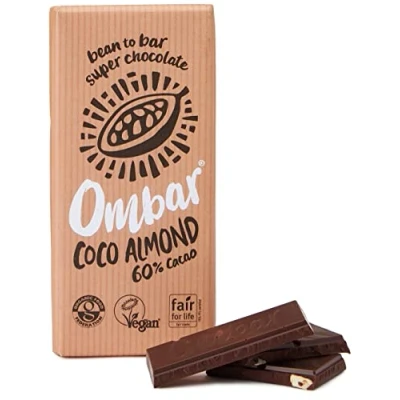 VEGAN CHOCOLATE BAR: Ombar Coco Almond vegan chocolate has deep, rich chocolatey notes combined with crunchy activated almond pieces. Sounds amazing, right?! Well, there’s more, it’s made with caramel-tasting, unrefined coconut sugar instead of refined sugar and creamed coconut to achieve a super-smooth, melt-in-the-mouth texture. The perfect vegan treat to satisfy that sweet tooth! DAIRY & GLUTEN FREE: Made with all-natural, plant-based ingredients, our vegan chocolate is completely free from dairy and certified vegan by the Vegan Society. We achieve a delicious creamy taste by using creamed coconut instead of milk, and all of our chocolate contains absolutely no gluten. RAW CACAO: The cacao we use is sourced from Ecuador; the country’s climate produces some of the best tasting cacao in the world. Most chocolate is made by roasting cacao at high heat, which could damage the heat-sensitive cacao polyphenols (super-healthy plant compounds). At Ombar, our cacao goes through a low-temp process, meaning it stays choc-full of all the goodness that nature intended! Plus, cacao contains Manganese, which means that every one of our bars is a source of Manganese too. ORGANIC & FAIRTRADE: Our chocolate is certified organic by the Organic Food Federation, which means that no damaging chemicals are involved in the production of our cacao or other ingredients. The cacao and coconut sugar we use are both certified fair trade by Fair for Life; our cacao is sourced directly from farmer’s co-ops in Ecuador, and we’re proud to pay more for it than even the fair trade recommended price. We think that’s only right! MADE IN THE UK: Our whole team is truly passionate about creating healthier, more nourishing vegan chocolate, which we craft from bean to bar in our small Cambridge factory.