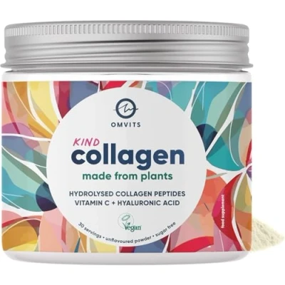 5X HIGHER ABSORPTION - Just 2.5g of Kind Collagen delivers visible results for your skin, hair and nails, compared to 10g+ required of animal collagen. This is due to our low molecular weight of just 500 Daltons ensuring faster and more effective absorption compared to Bovine and Marine collagen. SCIENCE-BACKED RESULTS FOR SKIN, HAIR & NAILS - Just a 2.5g dose is clinically studied to visibly reduce fine lines and wrinkles by 50% and hair fall by 42% in as little as 8 weeks. Omvits vegan collagen powder is infused with Hyaluronic acid and Vitamin C for elasticity, hydration, and collagen production giving a youthful glow. 100% VEGAN COLLAGEN PEPTIDES - The first true vegan collagen alternative, crafted to deliver the same benefits as bovine and marine collagen without animal products. Most vegan collagen supplements don’t contain any actual collagen and are sold as “collagen boosters”. Kind Collagen is designed to mimic types I & III human collagen with a potent 2500mg of plant-based hydrolysed collagen peptides per serving—the ideal collagen for vegans, vegetarians and people who prefer clean alternatives. NO TASTE OR SMELL - Our unflavoured collagen powder blends effortlessly into drinks without clumping, making it simple to incorporate into your daily routine, whether it's in your morning coffee or afternoon smoothie. Our plant based collagen is ideal for busy people! CONTAMINANT-FREE & PLANET-FRIENDLY - Produced in a zero-water waste facility with upcycled raw materials and fully recyclable packaging, Kind Collagen is kind to you and the planet! Plus, unlike marine & bovine collagen, there is zero risk of heavy metals and other contaminants. Enjoy peace of mind with every scoop!
