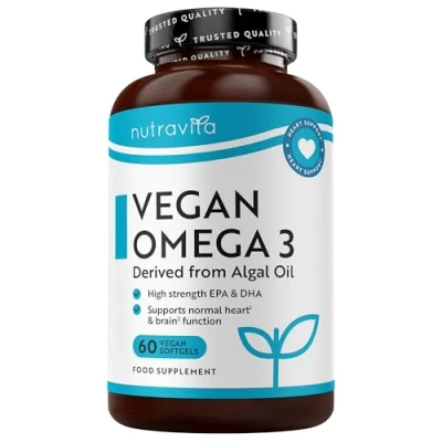 Vegan High Strength Omega 3 2000mg Soft Gels 600mg DHA & 300mg EPA per Serving Plant Based Softgels Derived from Sustainable Algal Oil 60 Made in The UK by Nutravita