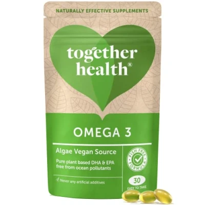 NATURAL, FISH-FREE OMEGA 3: Our award-winning vegan omega 3 supplement is sourced from pure algae, so it’s free from any contaminants you’d find in fish oil. Plus, there’s no fishy aftertaste. IDEAL RATIO OF DHA & EPA: Our pure vegan algae soft gels are brimming with the perfect ratio of naturally extracted DHA & EPA to support daily nutrition. SUSTAINABLY GROWN & HARVESTED: We're dedicated to producing the finest omega 3 - that never contributes to the disruption of delicate marine ecosystems. Our algae are sustainably grown on land and extracted without chemicals. So they’re better for you and the ocean. CLEAN, PURE, NATURALLY EFFECTIVE: At Together, we make products you can trust - and we’re proud of that. Our entire range is certified vegan and free from artificial additives and processing aids, so you only ever get the purest possible product. We use real ingredients, and that’s how we make nutrients that are gentle, easily absorbed and effective. Your body will love them. SAFE & ALLERGEN-FREE: Our omega 3 is made from algae grown in a 100% contamination-free environment, and is third party batch tested safe for heavy metals, microbes & pathogens. It is free from fish, wheat, yeast, gluten, soya, lactose, added sugars, additives, colourings, flavourings, preservatives and GMOs. We like to keep things natural.