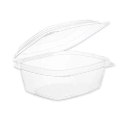 Disposable, curved deli food container. Integrated hinged lid. Ideal for use at salad bars. Made from PLA, a renewable material made from plants. Commercially compostable where accepted. Colour: Clear. Size: 8oz. Pack of 300.