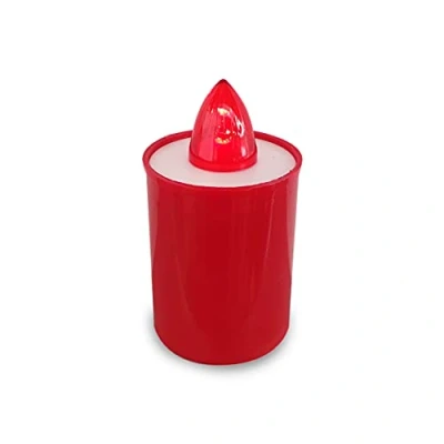 Small cemetery votive candle, electronic with fixed red light. Dimensions: (9cm x 5cm diameter). Long service life: 90 days (batteries included). Equipped with a fixed red light and an on/off button. Disposable: Non-replaceable batteries included. Dimensions: height 9 cm x diameter 5 cm / Light colour: red / candle colour: red / duration: 90 days. How to use: To light the candle, press the button on the base. Material: PP Contains 2 x LR6 alkaline batteries.