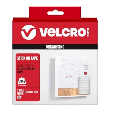 VELCRO Brand Stick On Tape Cut to Length Strong Hook & Loop Self Adhesive Sticky Perfect for Room Décor Home, Office, Garage Use White 20mm x 7.5m