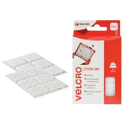 General description VELCRO® Brand Hook & Loop Stick On Squares are quick and easy-to-use adhesive squares designed to secure various items without the need for nails, screws, or glue. They provide a strong hold suitable for multiple applications and are ideal for DIY projects and home improvements. Technical specifications Color: White Size: 25mm x 25mm Quantity: Pack of 24 squares Maximum weight capacity: Up to 750g per square Adhesive reaches maximum strength after 24 hours Compatibility and accessories Suitable for use on various surfaces such as plastic, metal, wood, and fabric Compatible with other Velcro® hook and loop products Installation Peel off the backing to expose the adhesive Press firmly onto the desired surface Allow 24 hours for the adhesive to reach full strength Usage Use to attach lightweight objects, decorations, or fixtures Ideal for temporary or semi-permanent mounting solutions