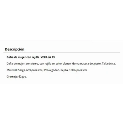 Rigid visor Elastic zone throughout the profile Breathable Twill 65% polyester - 35% cotton / 190 g/m2 Mesh 100% polyester / 60 g/m2, Manufacturer: Velilla