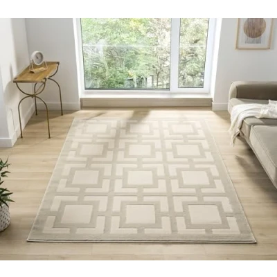 Vellure Modern Indoor Living Room Area Rug Embossed Cut Shrink Pile with Metallic Sheen Jute Backing Bedroom Hallway Carpet Maze Cream 200x290 cm