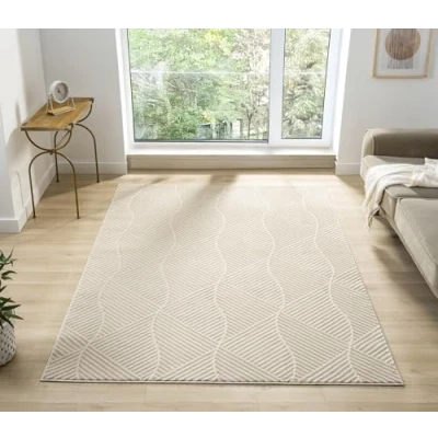 Vellure Modern Indoor Living Room Area Rug Embossed Cut Shrink Pile with Metallic Sheen Jute Backing Bedroom Hallway Carpet Pyramid Cream 200x290 cm