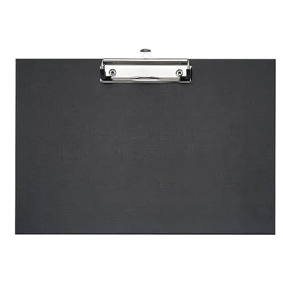 The black clipboard is in a handy DIN A4 landscape format The writing board features a nickel-plated metal clamp and a hanging eyelet With the clamping width of approx. 14 mm, it holds up to 100 sheets of 80 gsm paper Thanks to the sturdy cardboard core, safe writing is possible in any environment For the look and durability of the desk mat, it is laminated with PP film. This has a linen structure