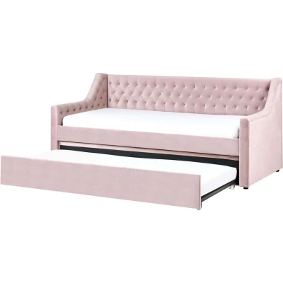 General description Velvet Daybed with a Trundle. Whether in a retro, glam, or traditional setting, this trundle bed makes a splendid addition to any room. Its solid, durable frame is tailored in soft-to-touch velvet, granting it a high-end, elegant look. The low armrests and tufted backrest highlight the classic design of the piece. Equipped with two slatted bases, the bed guarantees healthy and undisturbed sleep. Technical specifications Product Type: Daybed Style: Glam General Color: Pink Main Material: Velvet Material Composition: 100% Polyester Dimensions: Width: 91/189 cm, Length: 219 cm, Height: 94 cm Sleeping Surface: 90 x 200 cm Weight: 60 kg Weight Capacity: 150 kg Number of Slats: 24 Installation Full assembly required Estimated assembly time: 20-40 minutes Usage Second hidden bed to use when needed Perfect for both a bedroom and a living room Classic design with decorative tufting Other information To close the drawer easily, the height of the lower mattress should not